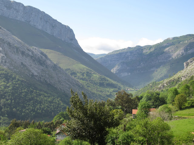 enlazamos con la pista asfaltada que desciende a Bustablado , a veces a la sombra de las hayas , robles y algún viejo castaño